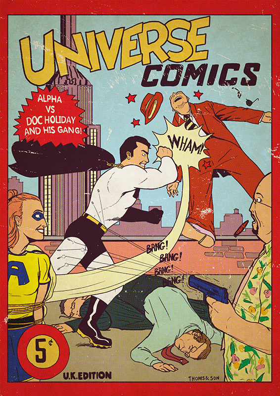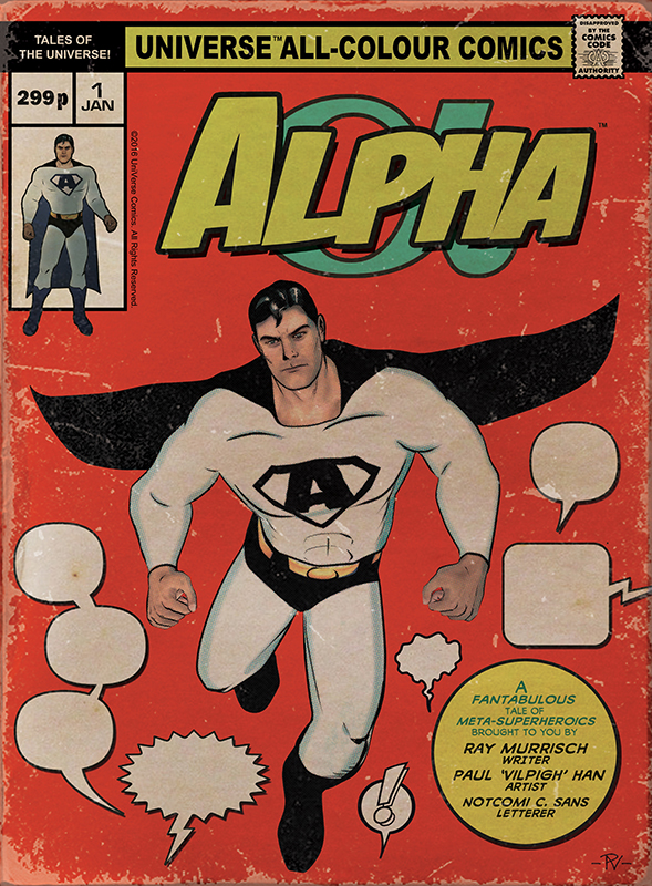 The idea was to create a number of fictional characters and titles, imagining that British superhero comics had become popular, and that Alpha, a fictional British superhero amalgamating characteristics of several real British superheroes, had a similar longevity to Superman. Alpha, it was imagined, had adapted to changing political, cultural and industrial circumstances from the 1930s to present. This prompted several questions. What would such a British superhero look like? How would he, the wider cast of characters, and the style of storytelling, change over the years? Rather than being purely speculative, the stories that were created were rooted in the now largely forgotten British superhero comics, and the imported and reprinted American material that appeared in Britain. There was a concerted attempt to reconstruct the style of comics produced by British creators like Jack Glass, Len Fullerton, Mick Anglo, Alan Moore, Grant Morrison, Dave Gibbons, and many others to investigate the history of British superhero comics, and the strategies employed in these comics. The creation of a fictional alternate British comics history where British Superhero comics were popular allowed for a creative re-imagining of British superhero comics using the conventions of the genre, where alternate realities and ‘ret-conning’ of stories and characters is commonplace.